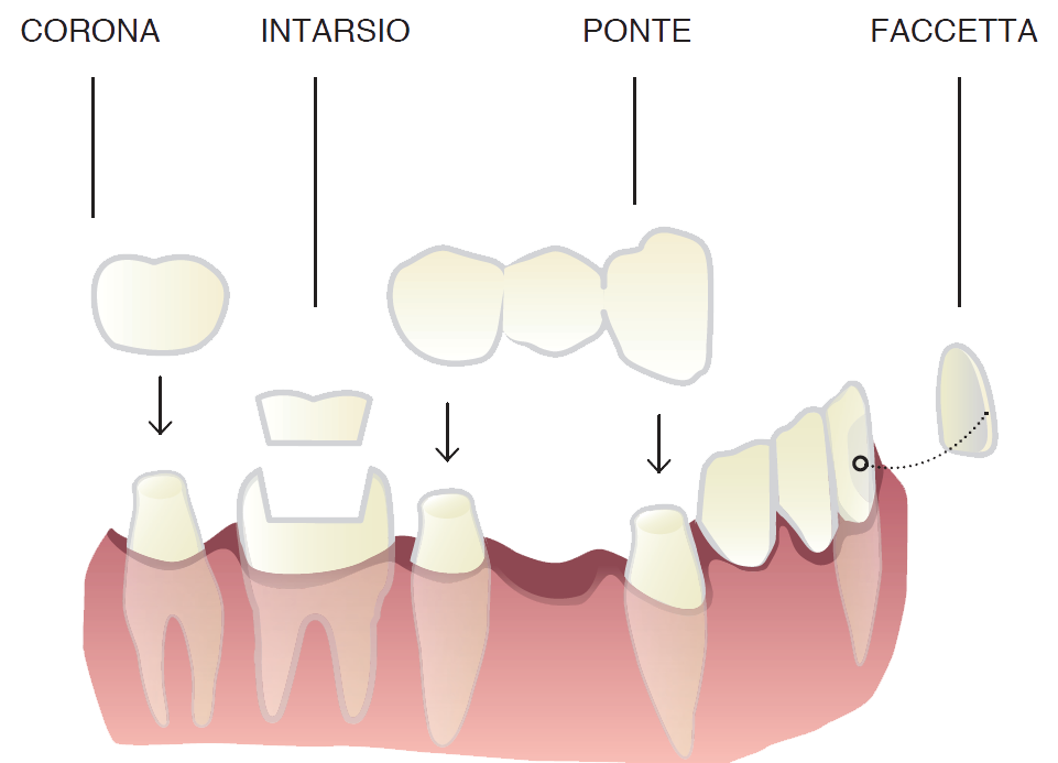 Comunemente vengo chiamati Ponti (piu elementi di protesi fissa), Corona o Capsula (elementi singoli di protesi fissa), Faccette.